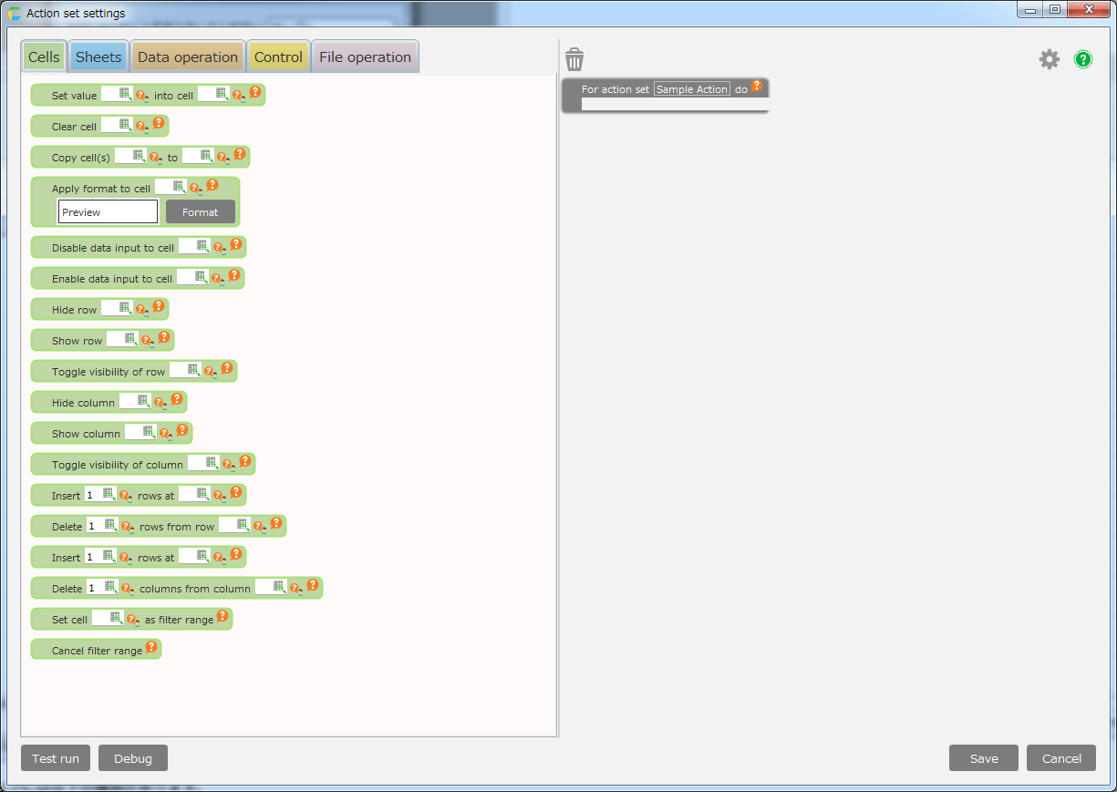 Type Details Cells This is the action group about cell like setting the value into the cell. Sheets This is action group about sheet operations like the action to change sheet. Data operation This is action group about data like getting data from table. Control This is action group about condition like the action for branch on condition. File operation This is action group about file operation like uploading the file. Tip