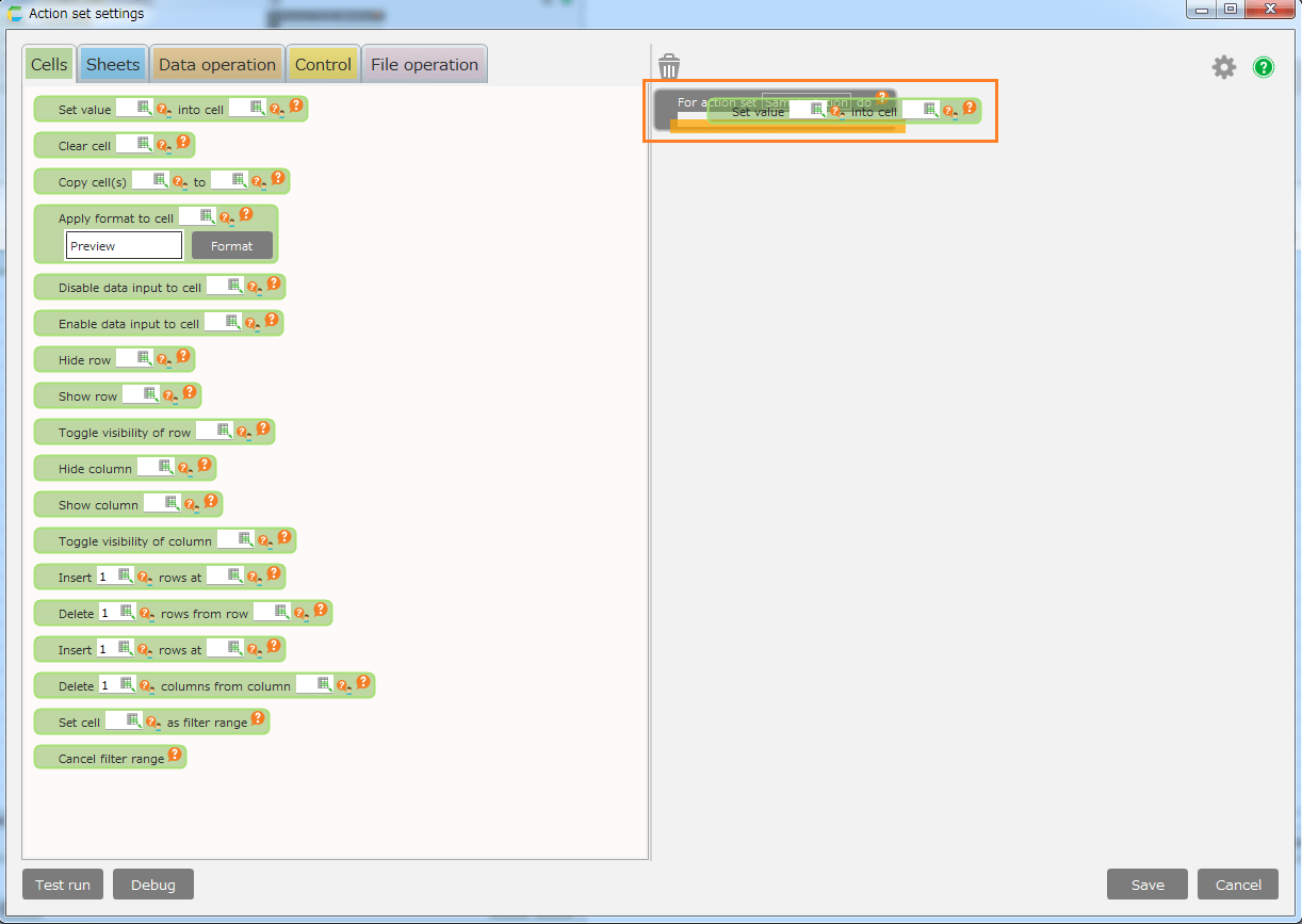 - Click action tab to use in 'Action set settings' dialog, and then drag it with keeping left click into edit area on the right side from the pallet area on the left side.