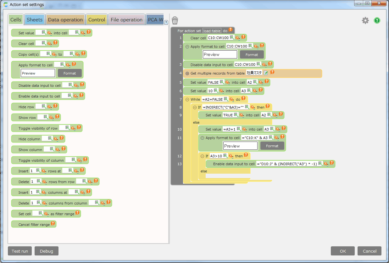 Action set is a function to run multiple procedures automatically. By specifying action set, the action set can handle like Excel macro by recongnizing condition, getting value from cell, assembling each visual action like reading and writing to database and then can set loop the actions. Here is the way how to assemble actions.
