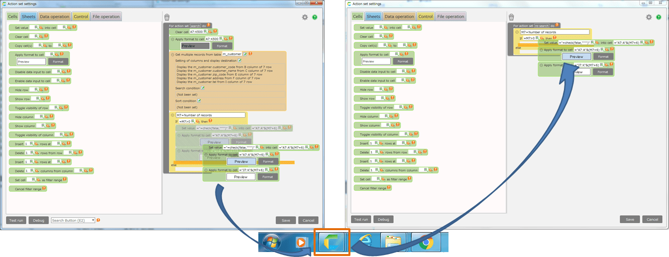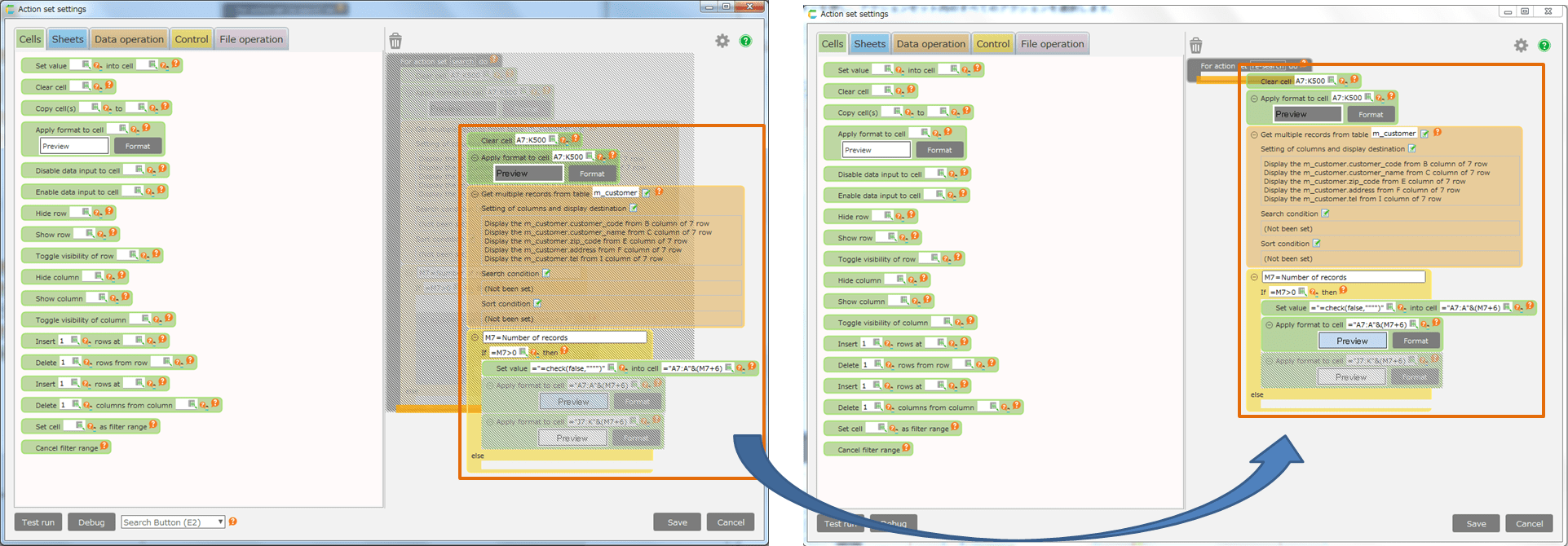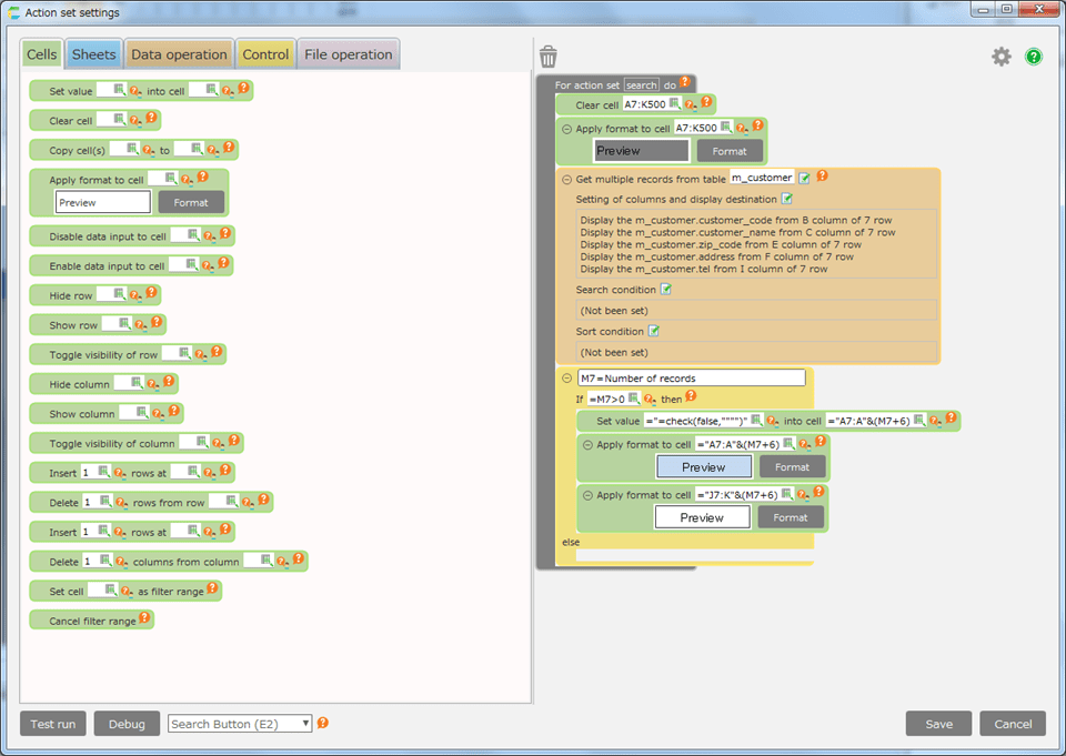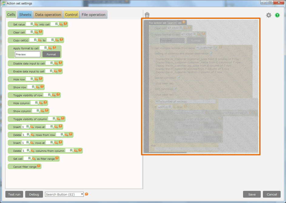 In the area where actions can be placed (dropped), the background color of the edit area will be orange.