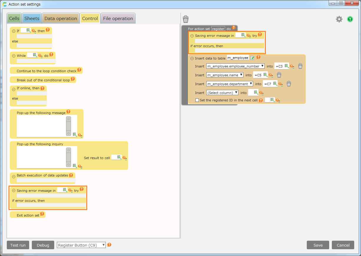 - Drag 'Saving Error Message' action from control tab, then set into the edit area.