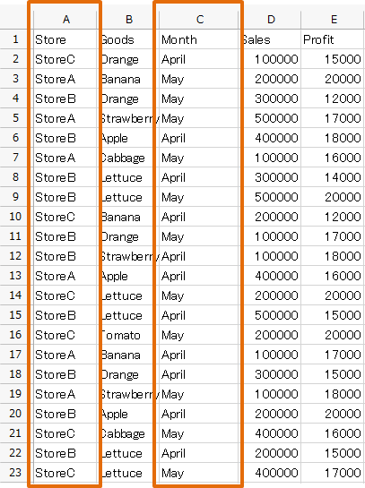 - The case of displayed 'Month' and 'Goods' as vertical axis, 'Store' as horizontal axis, Subtotal row of 'Month'.