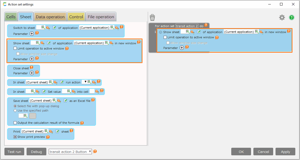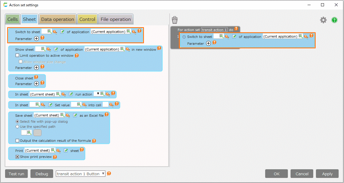 - Drag 'Switch to sheet of application' action from 'Sheet' tab, then set in the edit area.