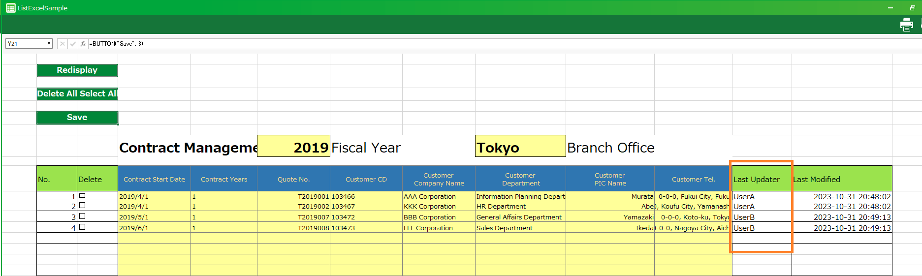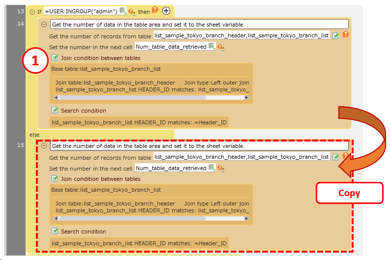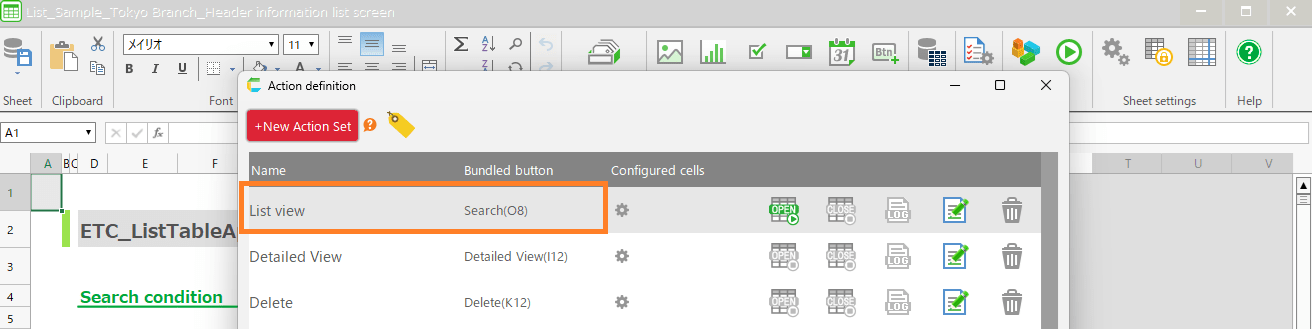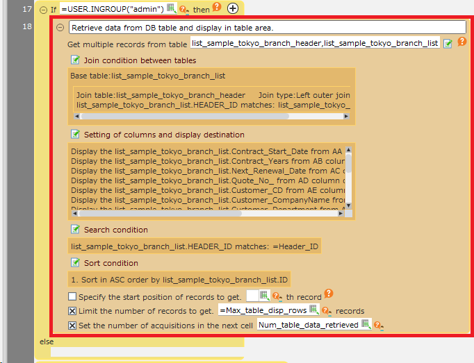 In the example, the action is targeted at actions where the reference table is retrieving data from 'List Sample_Tokyo Branch_list' in order to restrict the data to be displayed in the table.