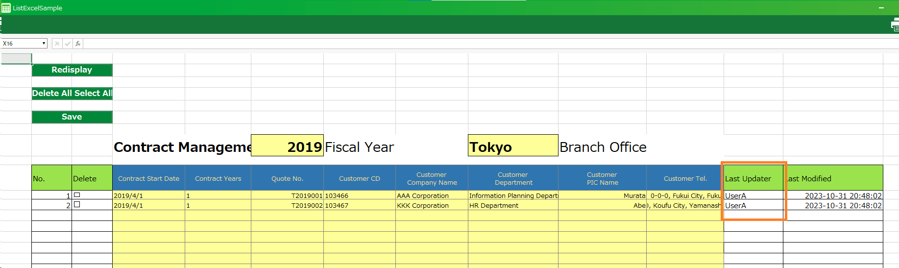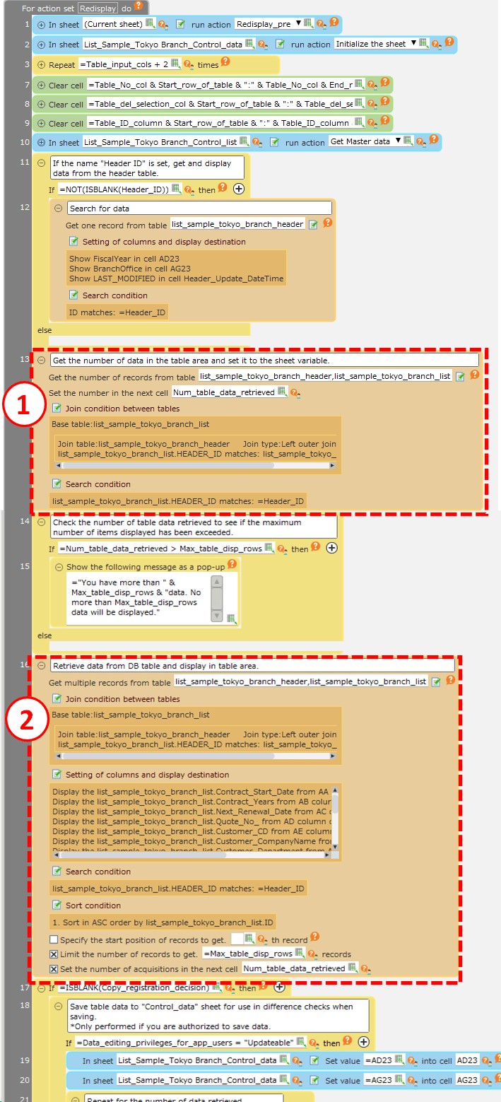 The example shows the restrictions on the display of data to be shown in the table area.To restrict the display of data on the Header Information List screen, open the 'Header Information List Screen' sheet and modify the 'List Display' action set.Attention