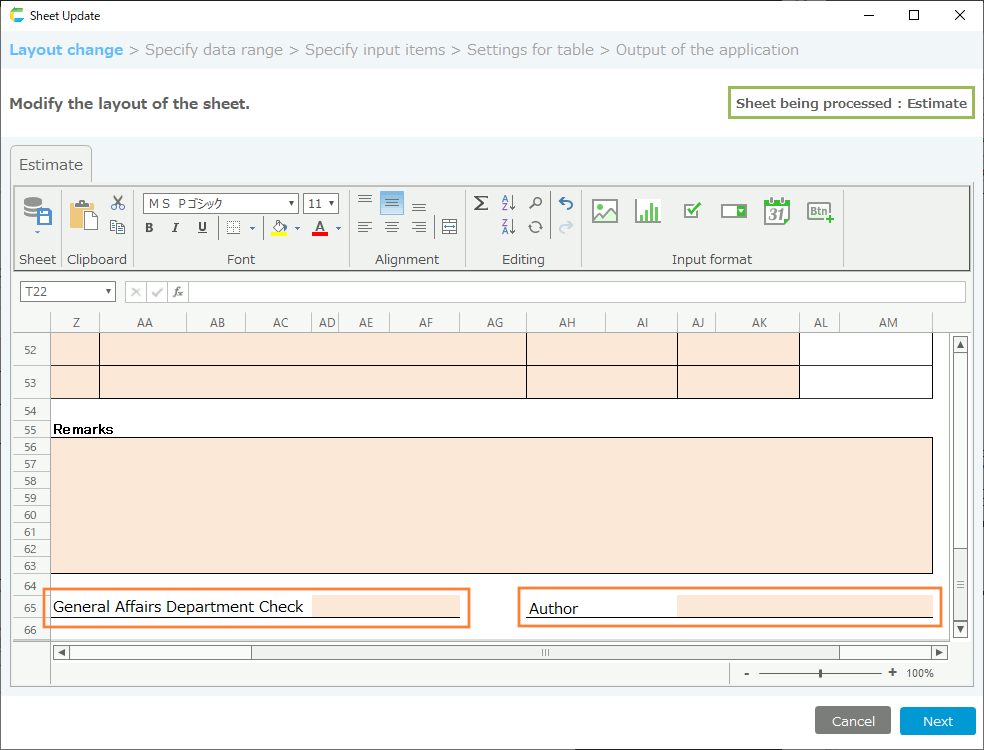 - When the "Sheet Update" window opens, add administrative items to the sheet in the "Layout change" screen.