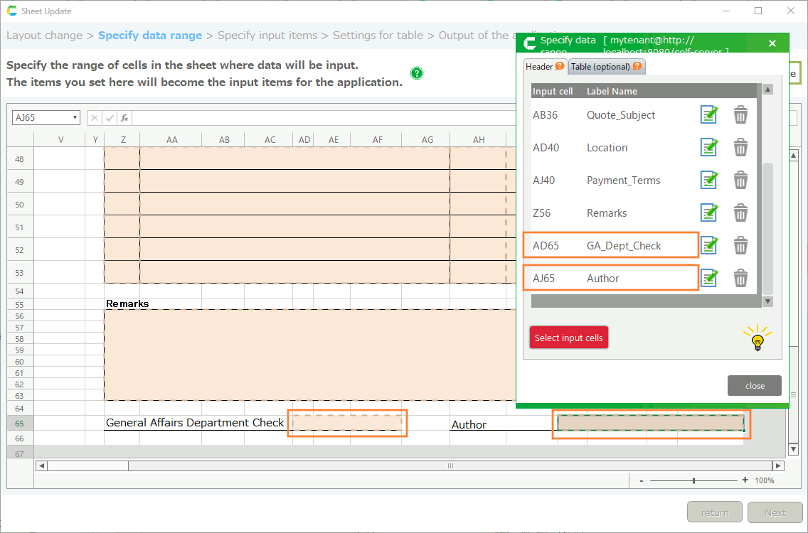 - Go to the "Specify data range" screen and specify the cells for the management item.