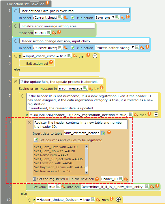In this example, "Register the header contents in a new table and number the header ID." action is targeted.