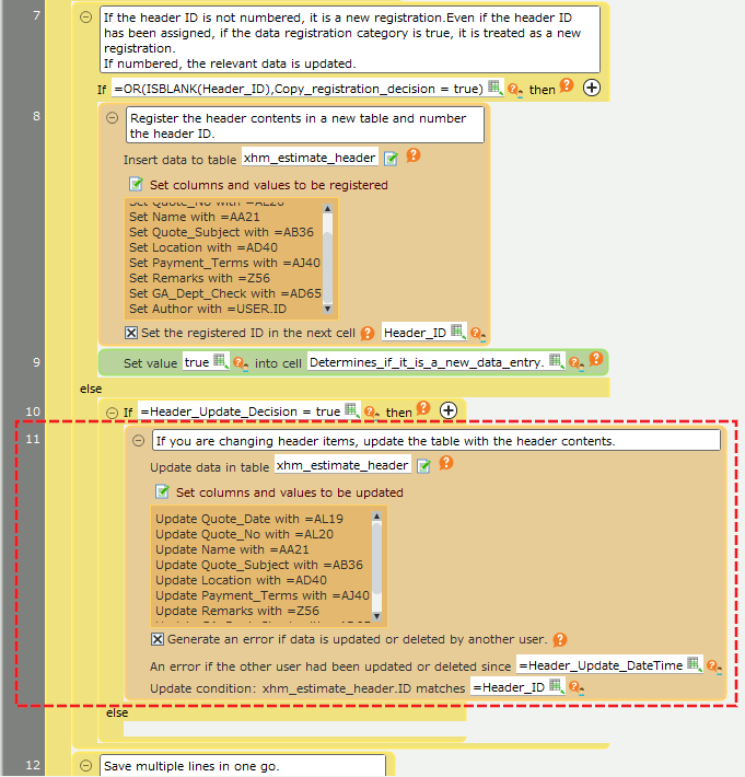 The position to be added is on the "Update table data" action.In this example, "If you are changing header items, update the table with the header contents." action is targeted.