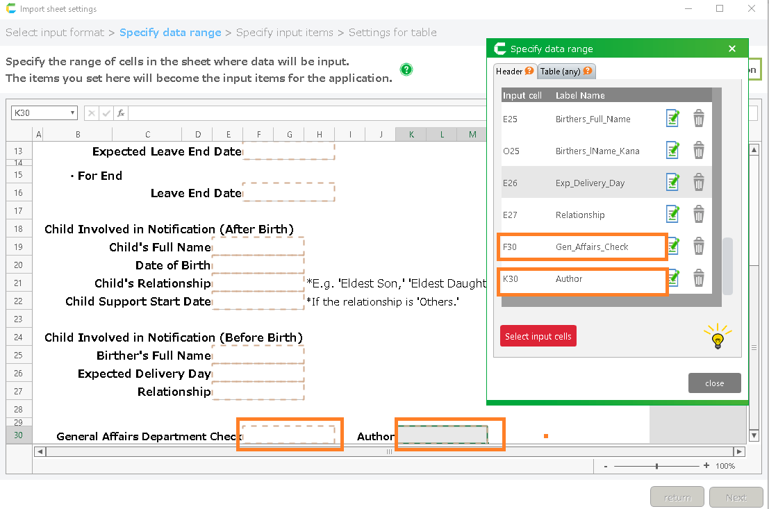 On the "Specifying the data range" screen, make sure that the management item and the creator item are selected respectively.![]()