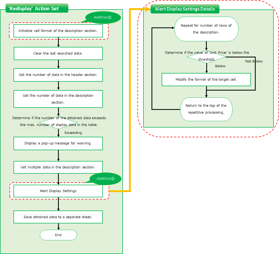 For "[sheet name]!F2 + 1", add 1 to the row number.This action causes the value to increase each time it is repeated with the "Repeat processing for the specified number of times" action, covering all rows in the unit price column.