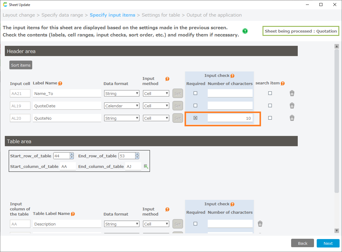 - Change the item settings on the Specify Input Items screen.