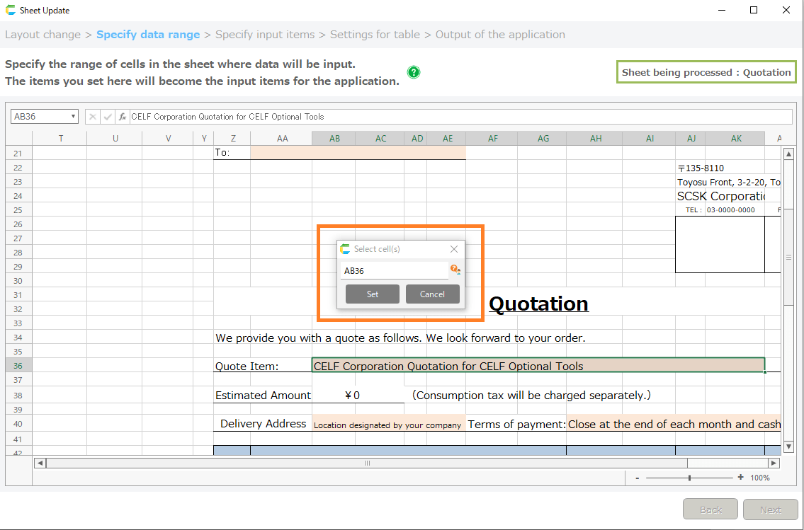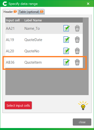 - Specify the cell to be the new input item on the Specify Data Range screen.