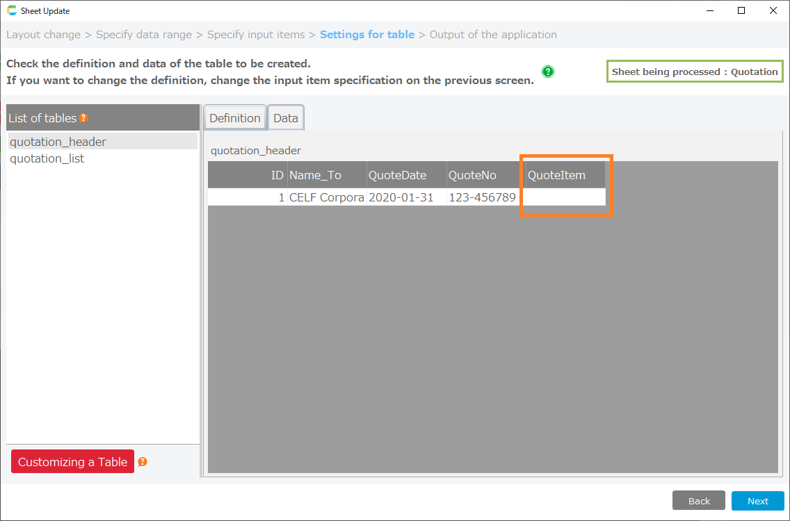 - On the 'Settings of table' screen, confirm that the items added to the header table are displayed and click the 'Next' button.