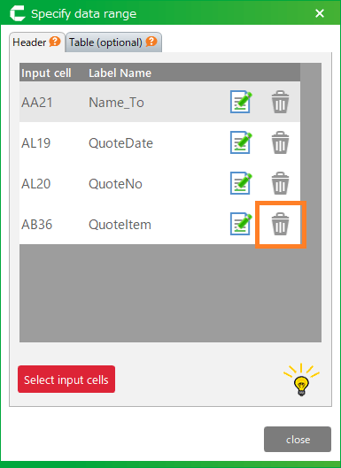 - On the Specify Data Range screen, click the 'trash can' icon for the item to be deleted.
