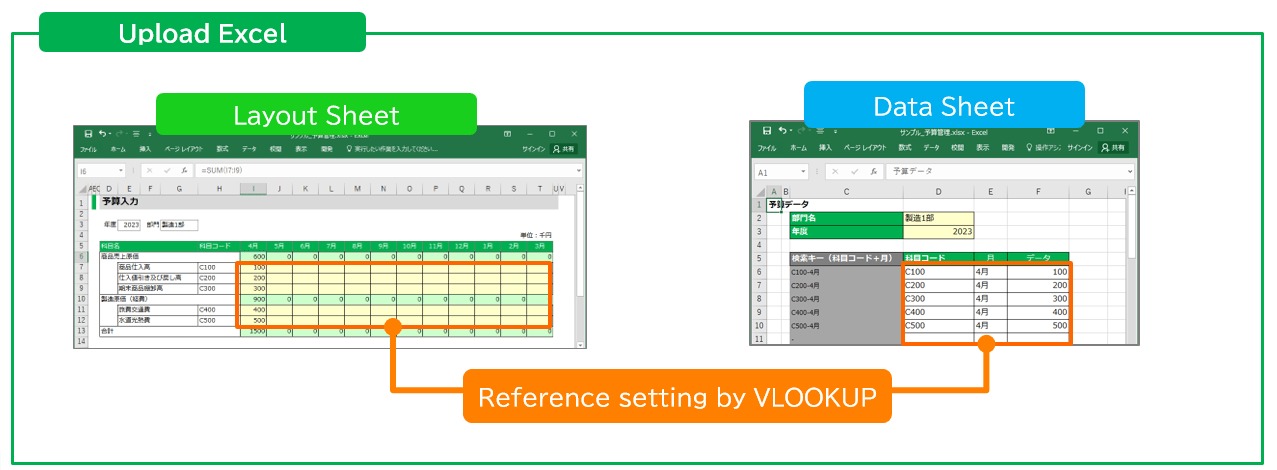 The Multiple sheet combination format requires the preparation of an Excel file containing three elements.Please make sure that the Excel file you have prepared contains each of these elements.1. "Sheet for layout" that becomes the application screen2. "Sheet for data" that converts data from the application screen into a table format that can be stored in a database3. "Reference setup by VLOOKUP" connecting sheets 1 and 2![]()