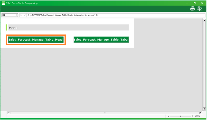 - When the application is launched, the menu screen will open. Click the "[Imported sheet]_Header Information List Screen" button.