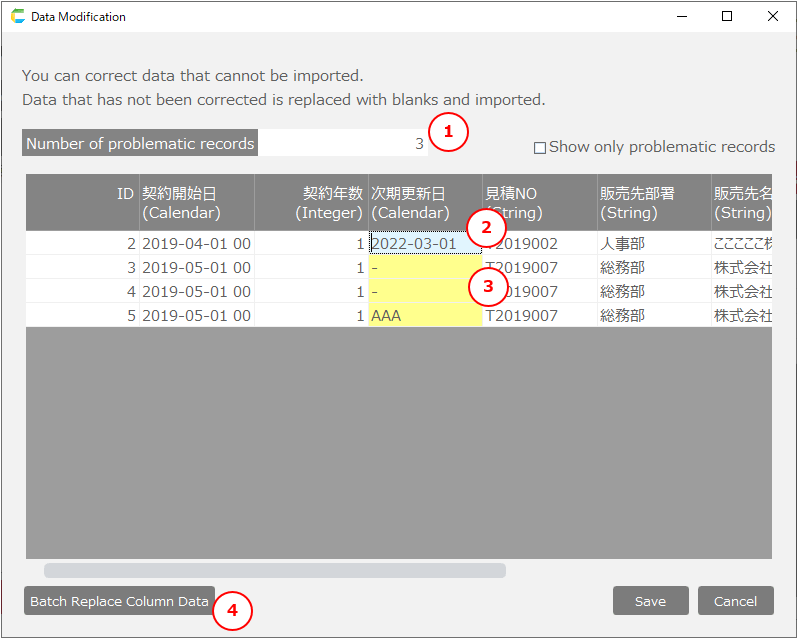 3) Problematic data … Data that cannot be imported. The cell background is displayed in yellow.