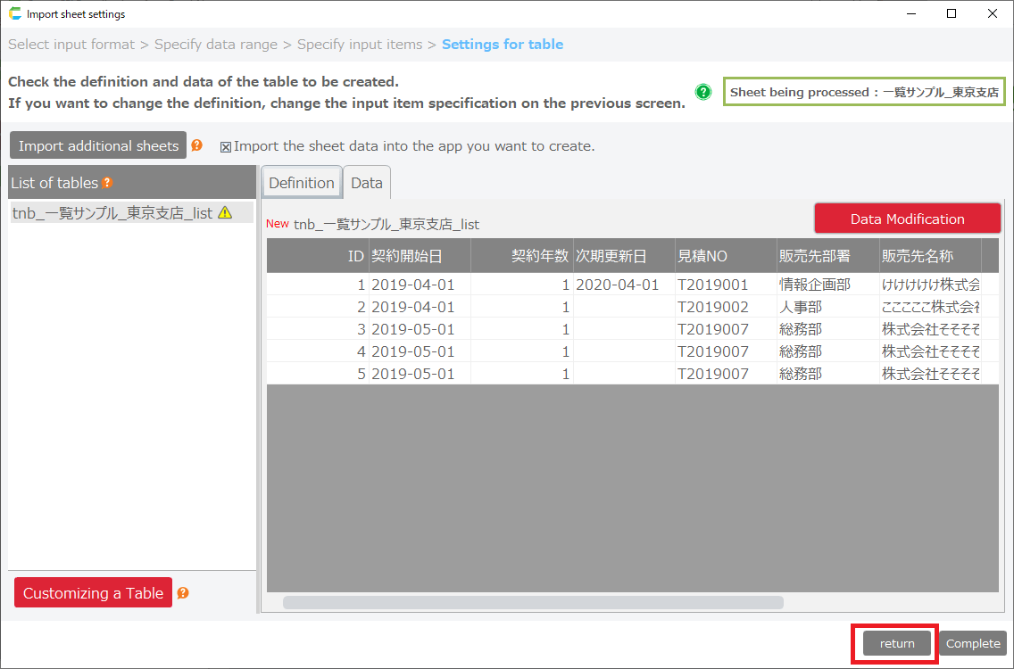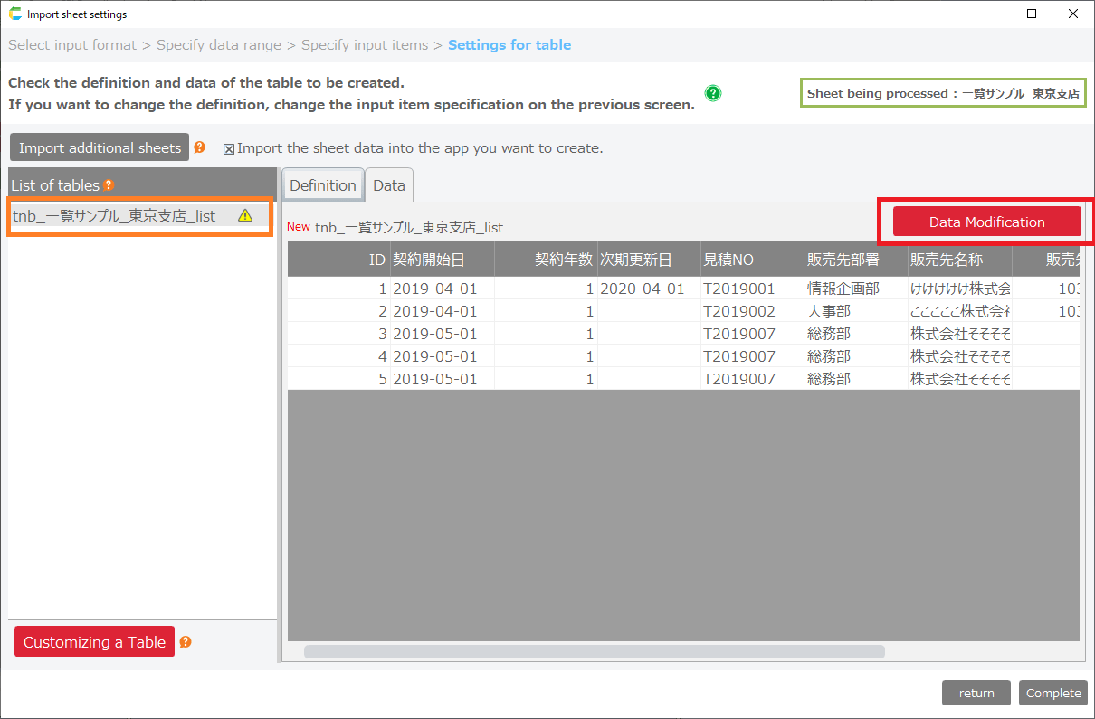 If there is data in the imported sheet that cannot be imported as initial data, the 'Data Modification' button will appear.