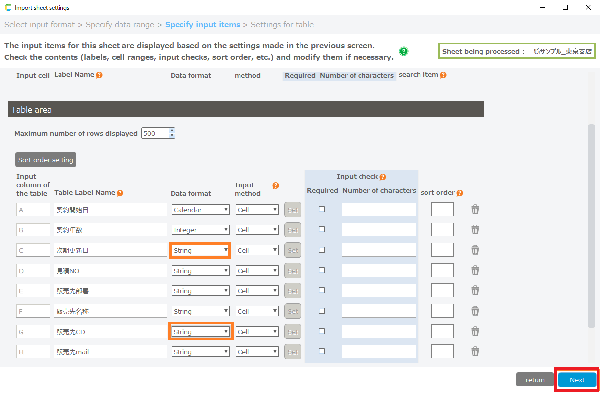 - From the Table Setup screen, click the return button to return to the Input Item Specification screen.