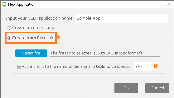This screen allows you to upload an Excel file to create an application from Excel.Select "Create from Excel file" to be able to select a file.![]()