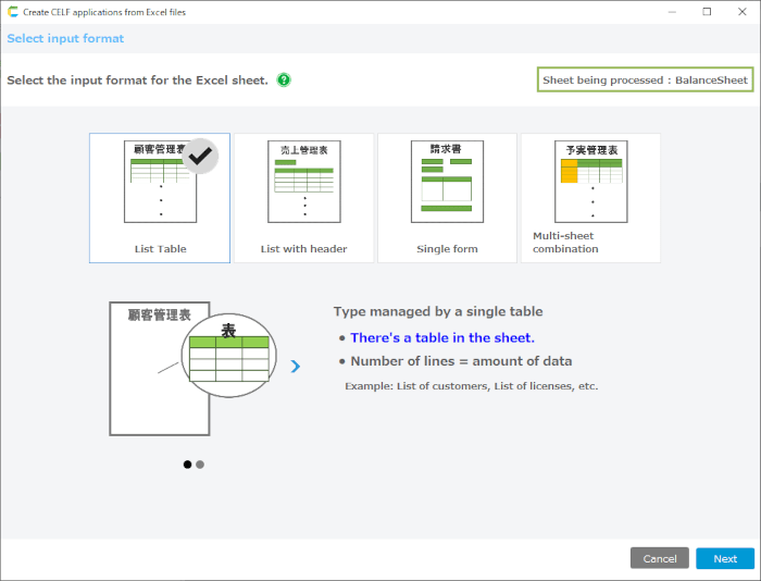 In this screen, select the input format of the sheet.The usage and screen structure of the application will change depending on the type you select here.![]()