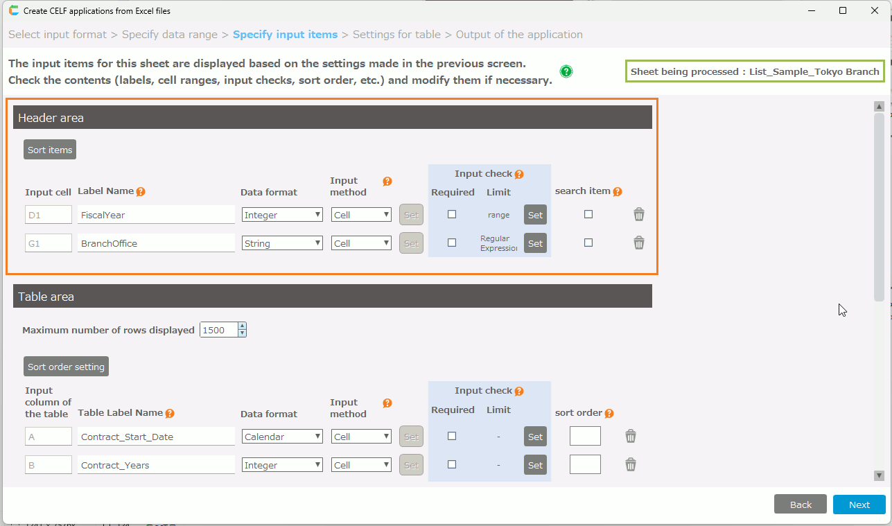 Start row of table (Single form type only) Specify row that displays data. Start column of table (Single form type only) Specify the start column of the table. End column of table (Single form type only) Specify the end column of the table. Maximum number of rows (List, List type with header only) The maximum number of rows in the list can be specified. Set it according to the number of data. Please note that if it is too large, the display will be slow. Sort order setting button Set the item by which the list will be sorted. Input column Specify input cell. Label Specify table label name. Data format Specify the input format for table items. The format specified here will be checked when the application is created. Input method Specify the data input method. The method can be specified from "Cell" (cell input) or "List" (pull-down list input). Set Specify a list value for the pull-down list. This setting is available only when the input method in the previous section is set to "List". Input check Set the input check for this item. Sort order When the application is launched, the data will be displayed in the sort order set for this item. See also