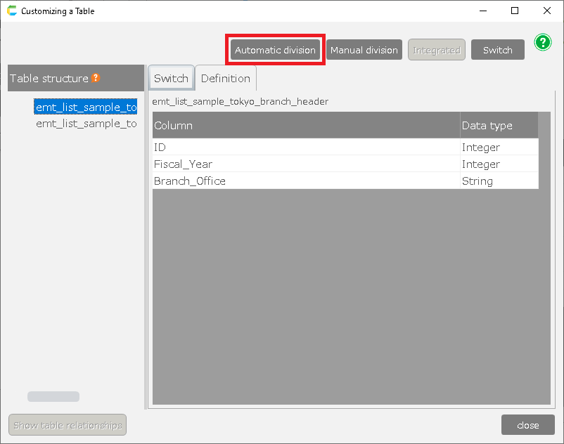 Items for "Automatic division" are judged based on the content of the data, so they may not be split as expected.![]()