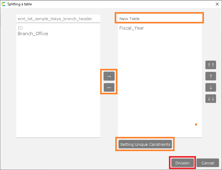 Set the details to be split. Enter the table name, and use "->" and "<-" to move the items you want to move to the destination table.Select the items in the destination table whose data will not be duplicated, and click "Setting Unique Constraints".When all the settings are complete, press "Split" to split the file.![]()