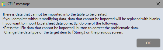 If you complete without correcting the data that cannot be imported, the data that cannot be imported will be replaced by blanks and imported.If you want to import Excel sheet data correctly, do one of the following.1)Correct problematic data on the 'Correct data that cannot be imported' screen.2)Change the data type of the target item to 'string' on the previous screen.For details on each operation, see below.
