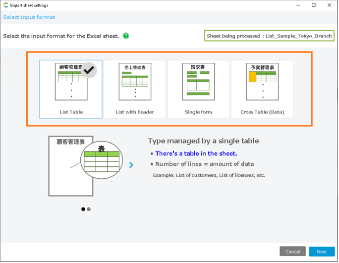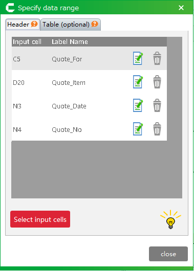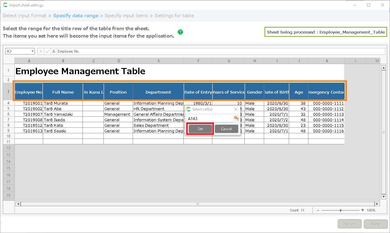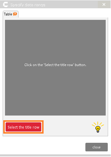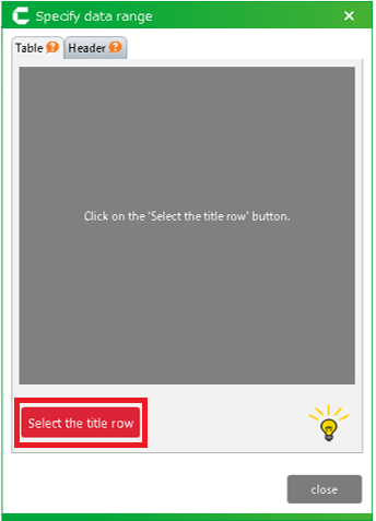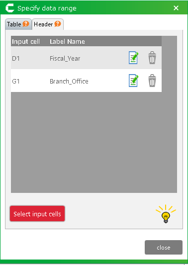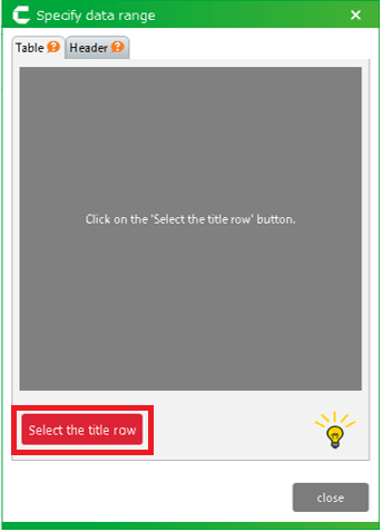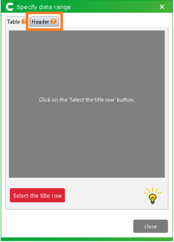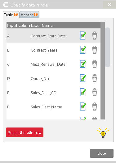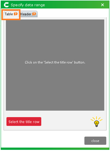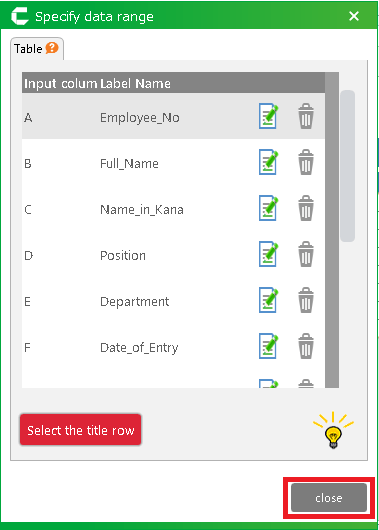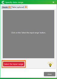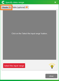 - The selected data range will be registered. When you have finished setting up the "Table" and "Header", close this dialog and proceed to the next screen.