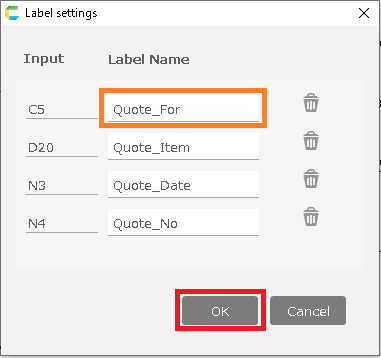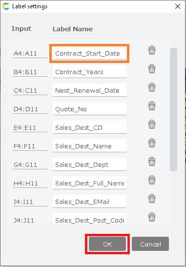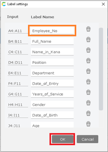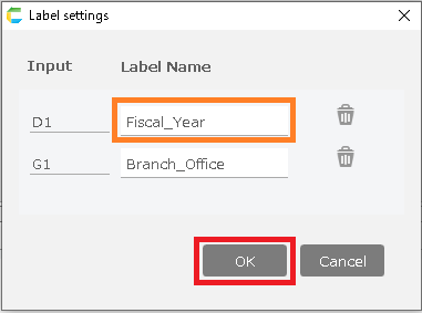 - The Set Label dialog box will open. Check the label names in the table, and if there is no problem, click the "OK" button.