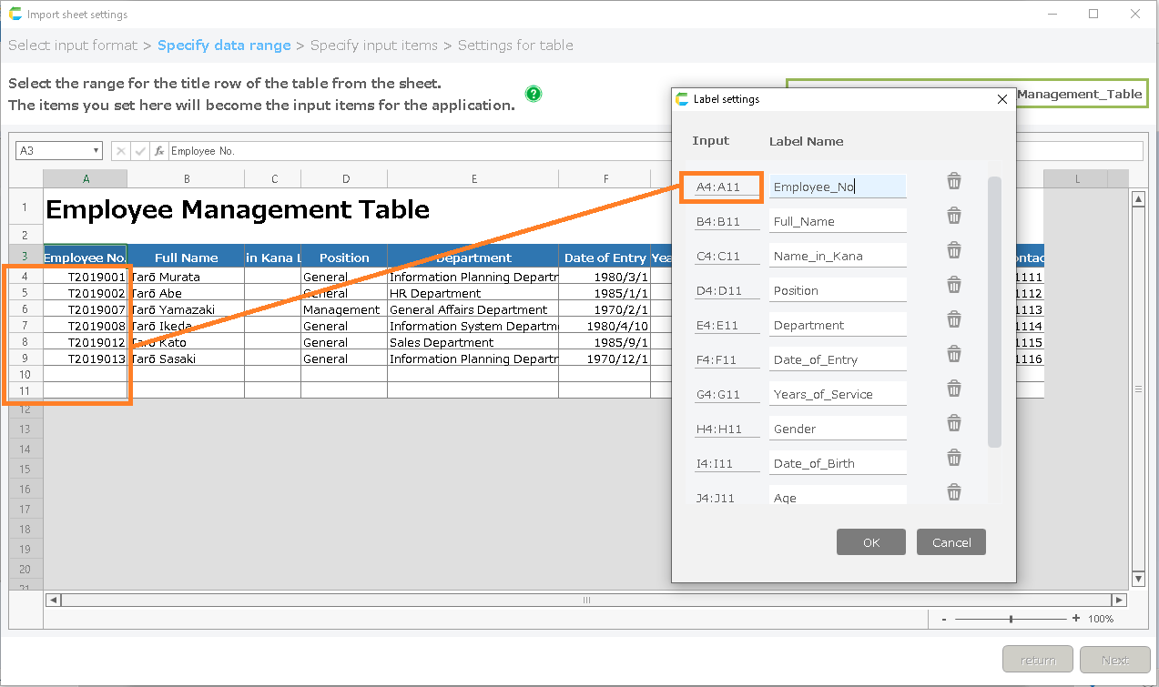 This section describes the detailed operations on how to specify the data range in the "Create app from Excel file" function.