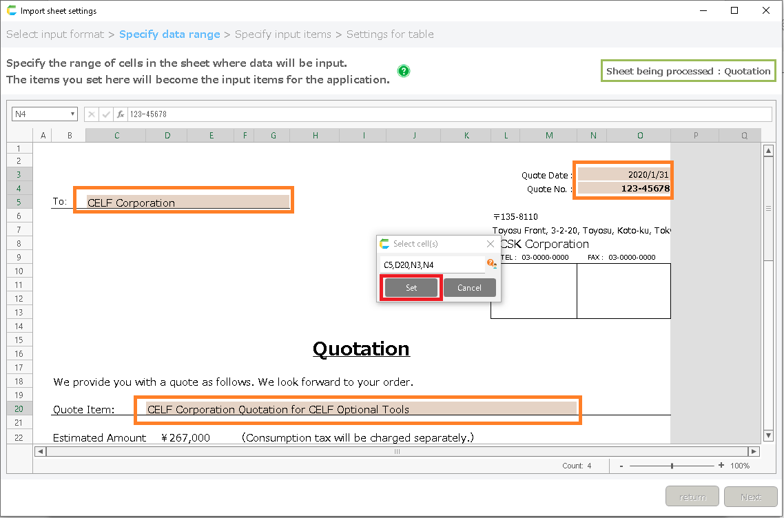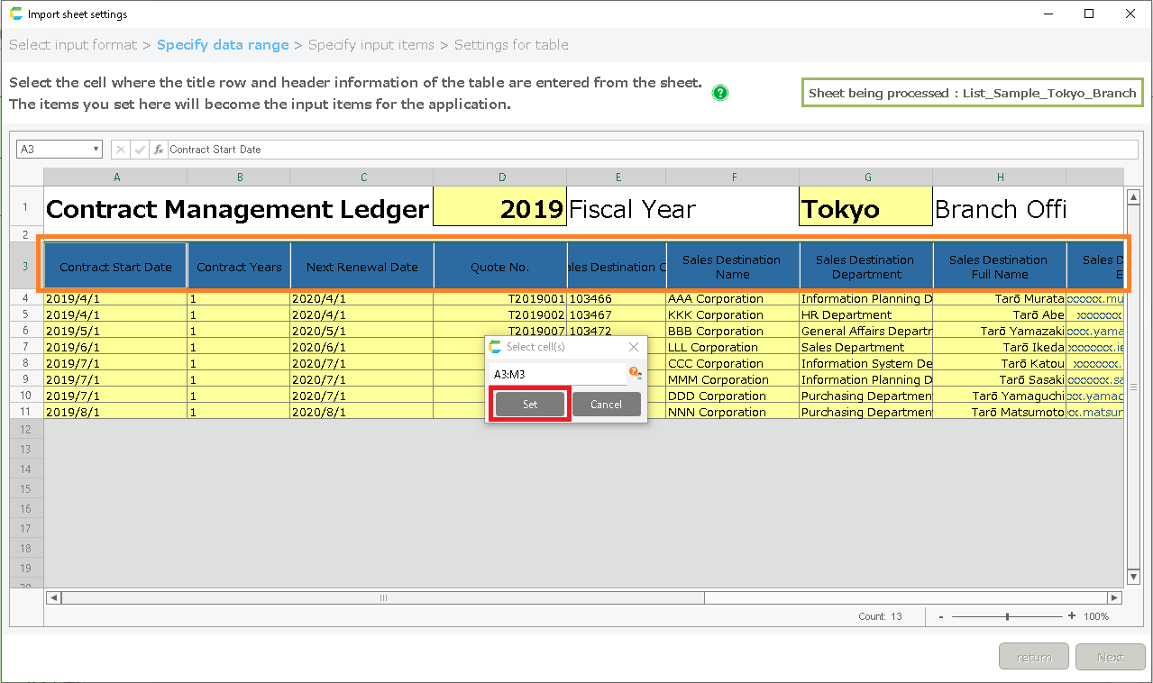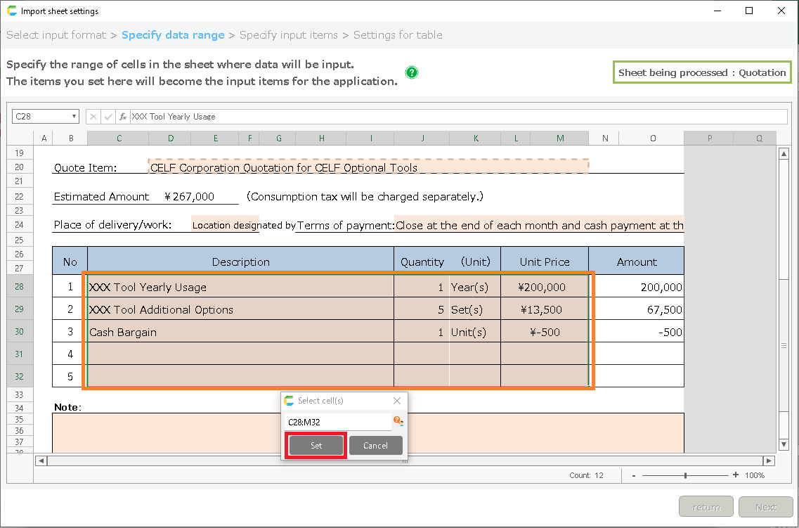 - The selected data range will be registered. If there are no problems, close this dialog and proceed to the next screen.