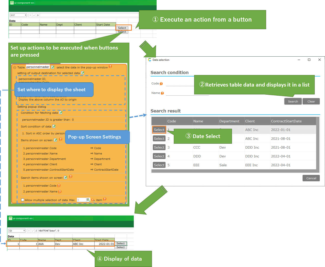- From the 'UI' tab, drag the 'Select table data in pop-up window' action and set it in the edit area.