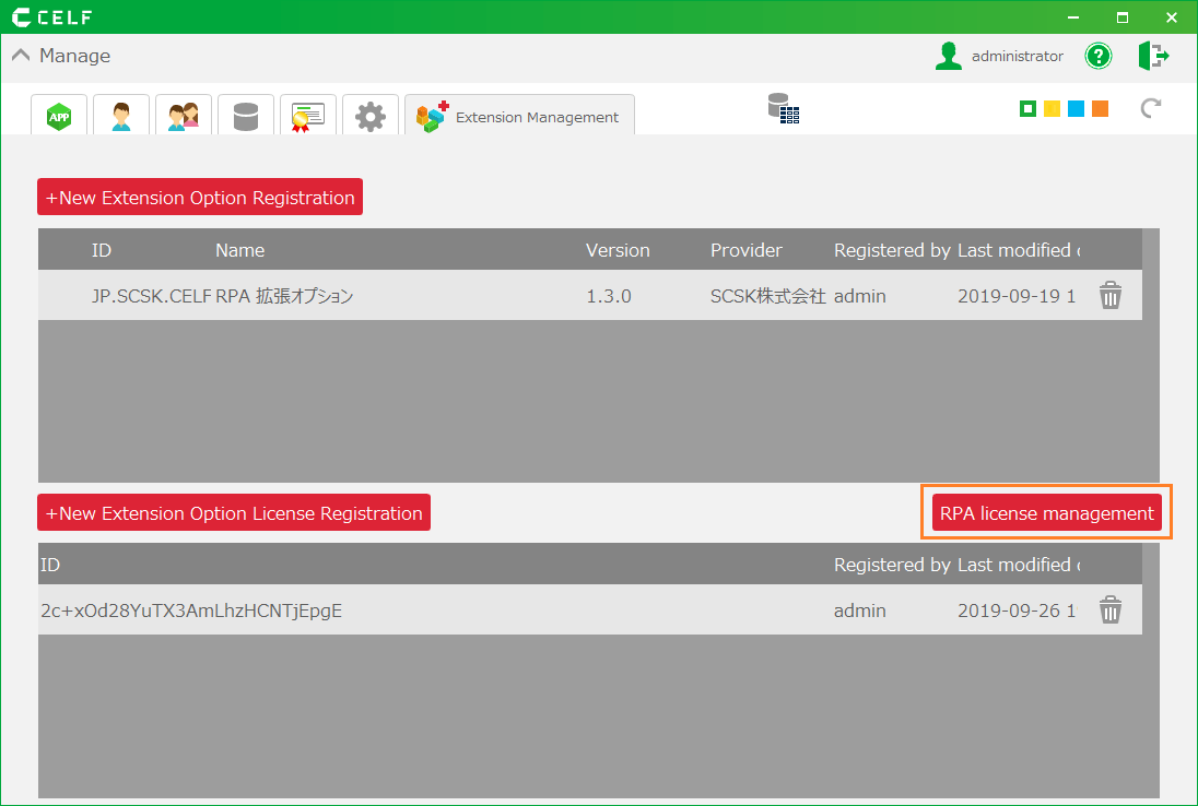 Make sure that the RPA Extended Option License is registered in advance. See Add new extension for registering licenses.