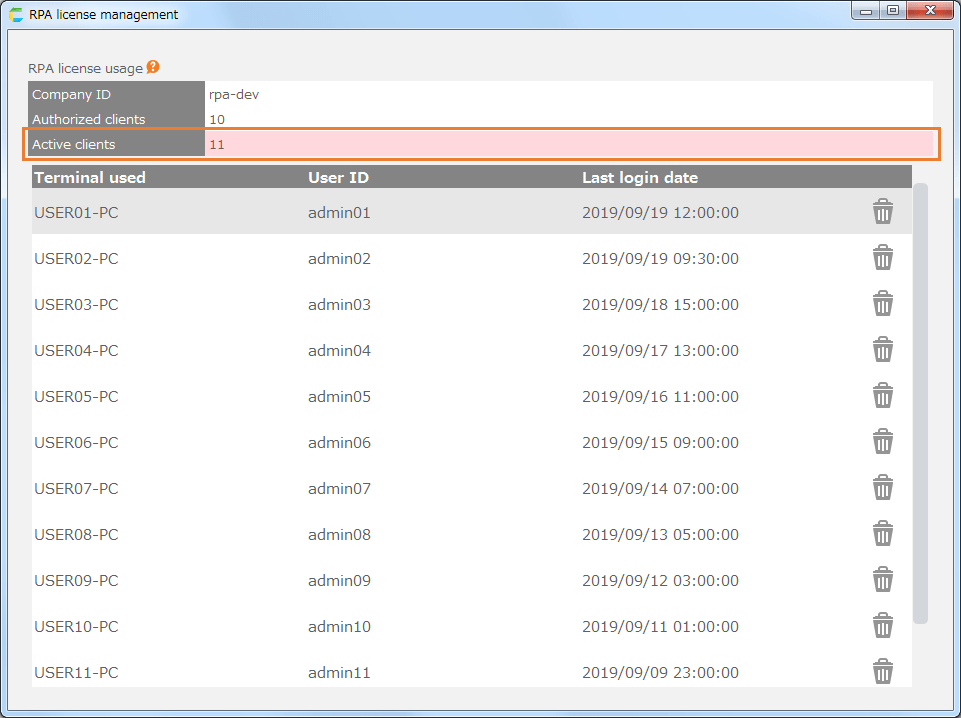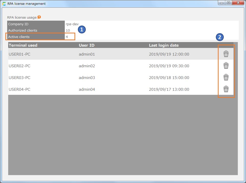 - On the RPA license management screen, you can check the terminals that are currently consuming RPA licenses.