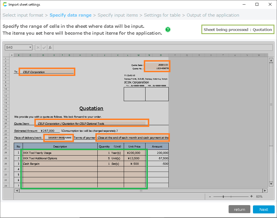 - When the 'Specify Data Range' dialog box displays what you have just specified, the header specification is complete.