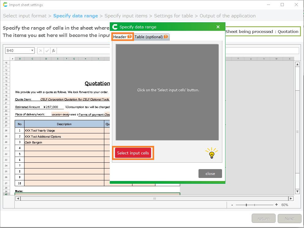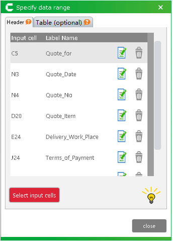 - Click the 'Select Input Cells' button from the header tab of the 'Specify Data Range' dialog.
