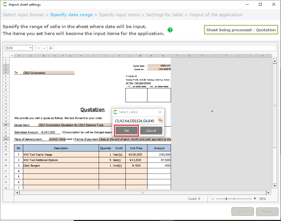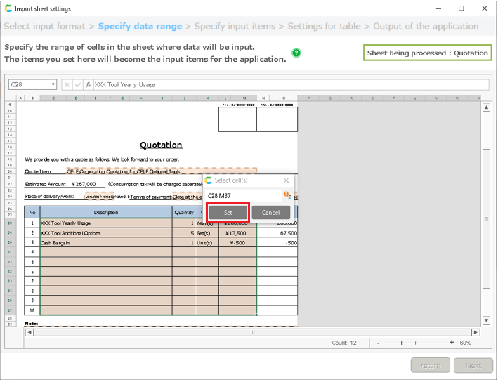 - Select the title row of the 'Table' and click 'Set.' In the sample, 'C28:M37' is the title row.