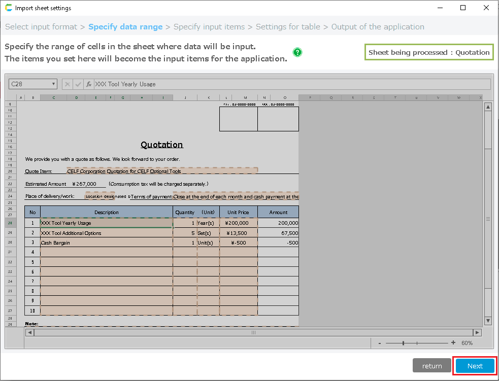 - When the 'Specify Data Range' dialog box displays what you have just specified, the table specification is complete.