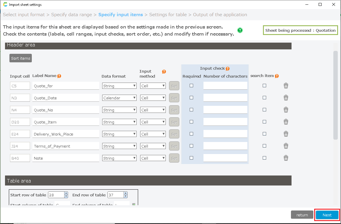 This screen allows detailed settings for the input items set on the previous screen.Click the 'Next' button.![]()