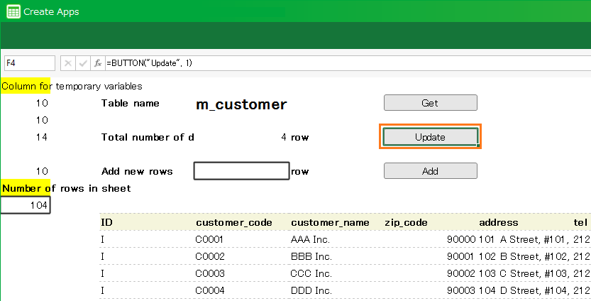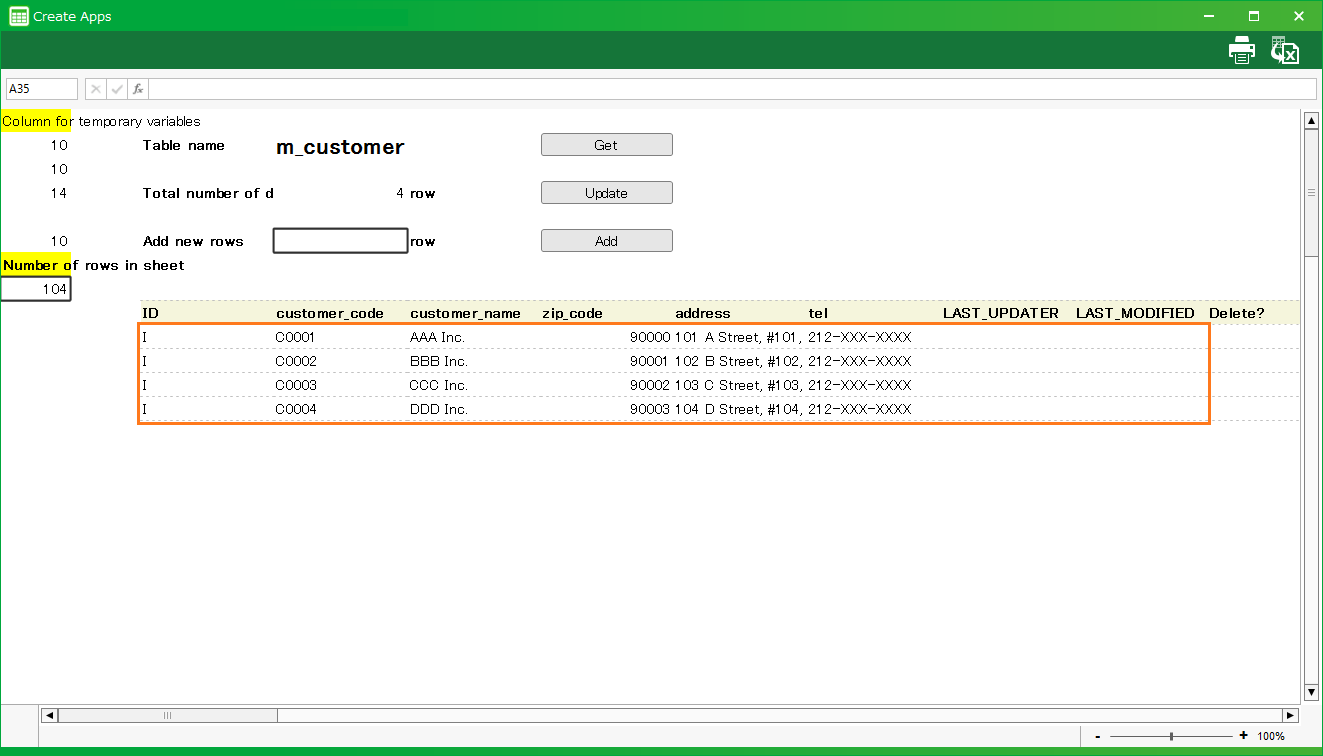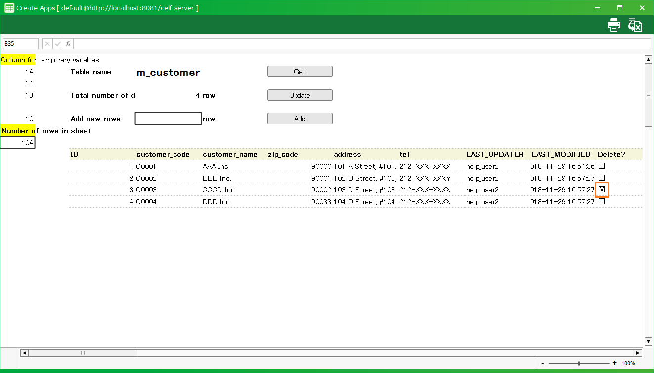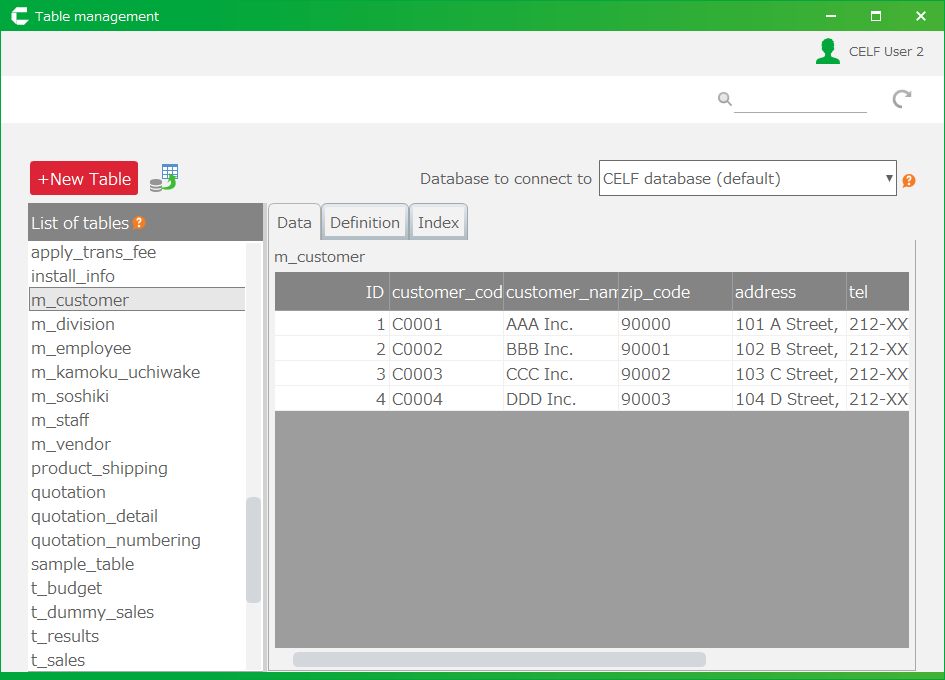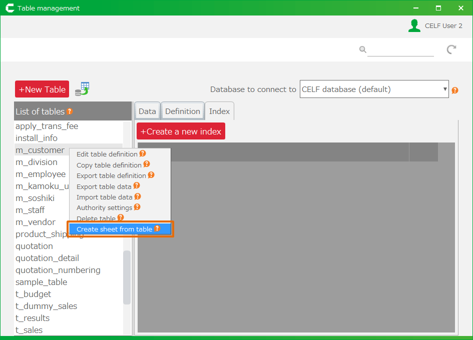 CELF では作成したテーブルからそのテーブルデータ管理(取得、登録、更新、および、削除)をするシートを自動生成することができます。