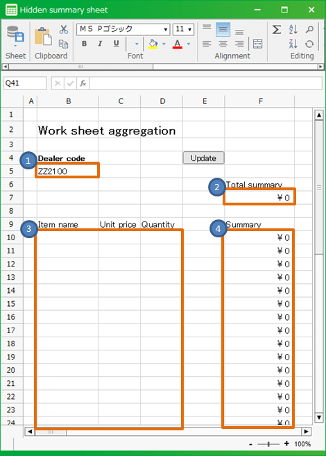 In sample application, prepare 2 sheets, 'Display result sheet' and 'Hidden summary sheet', and then get and summarise data in 'Hidden summary sheet', and lastly display the summary result in 'Display result sheet'.