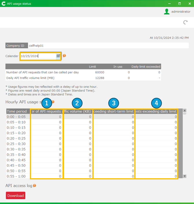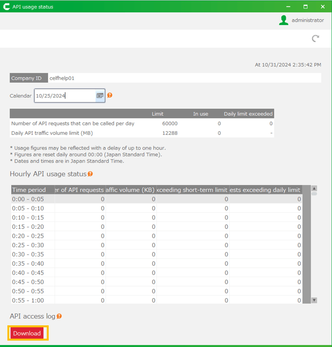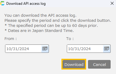 - Specify the period for which you want to download the API access log, and click the 'Download' button.