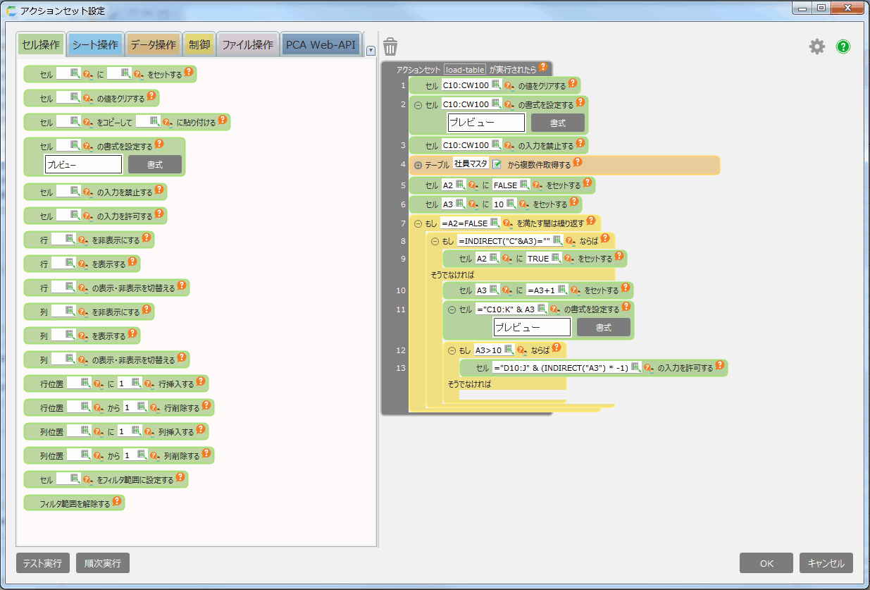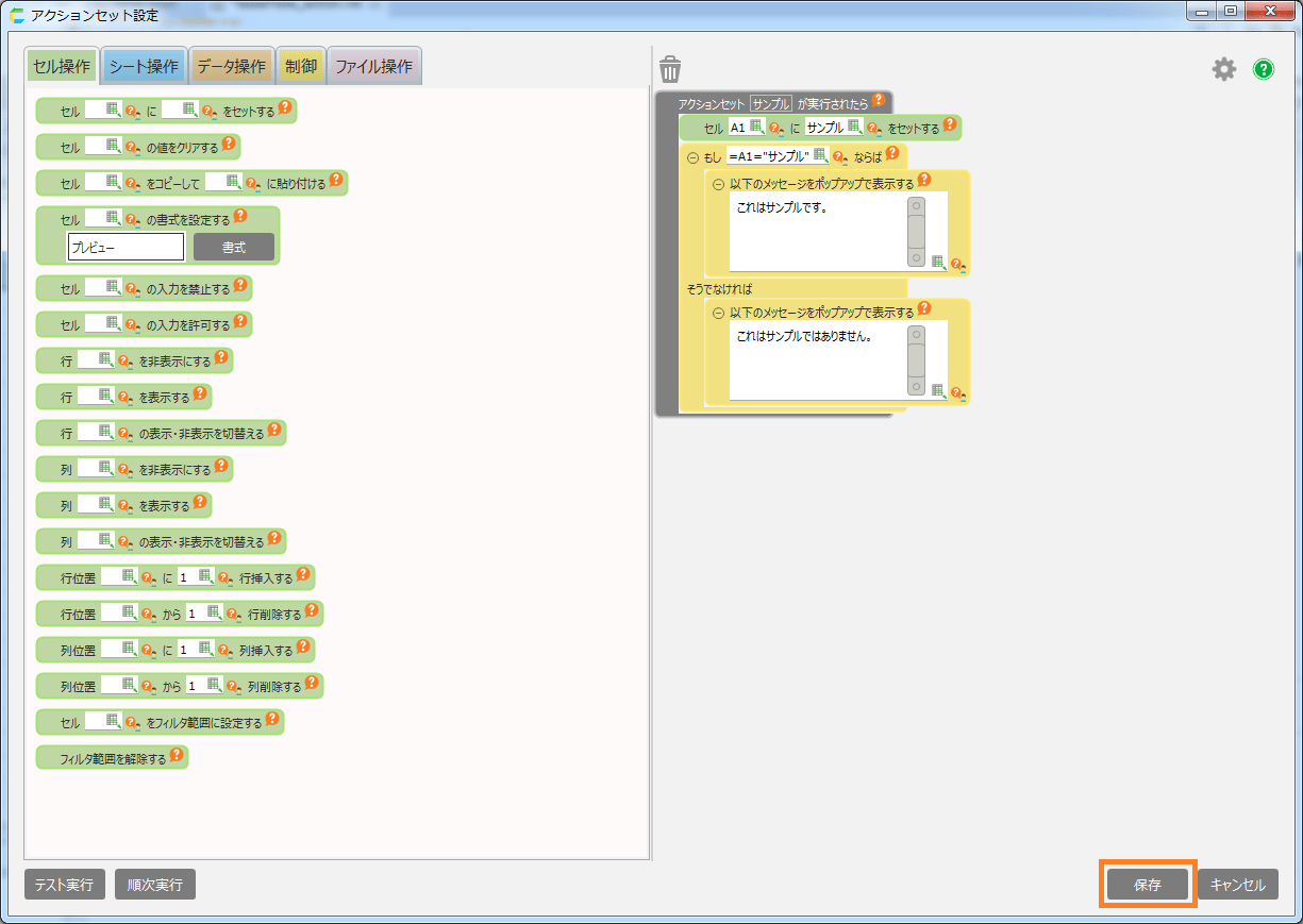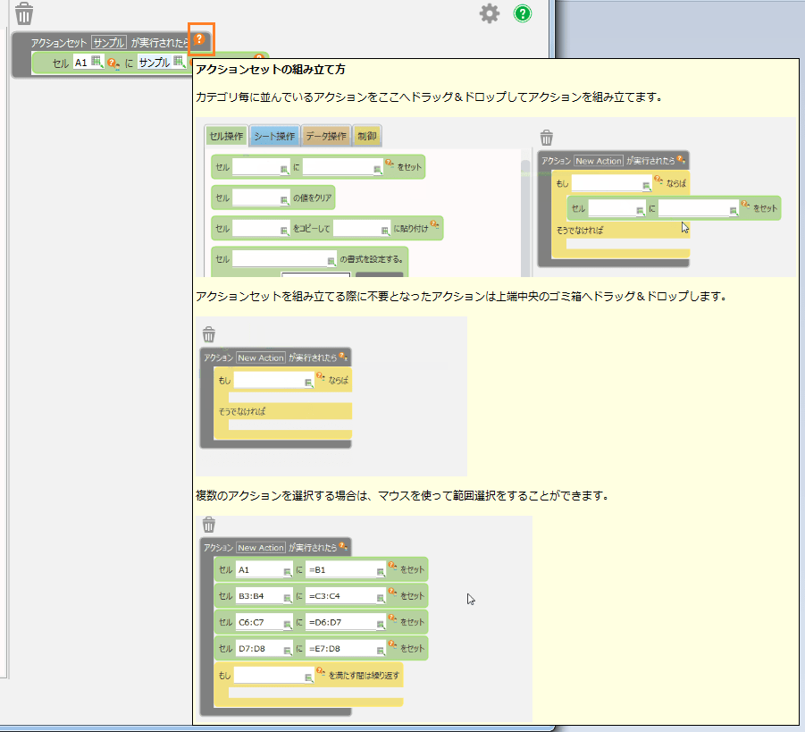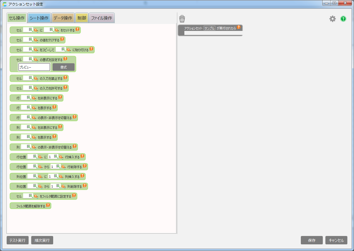 アクションセットとは、複数の手順を自動的に実行させる機能です。 アクションセットを定義することにより、条件の判断やセルからの値の取得、データベースへの読み書きなどの 単機能のビジュアルなアクションを組み合わせて作成した手順の組み合わせに名前をつけて繰り返し使えるようにし Excel のマクロのように動作をさせることができます。 ここではアクションの組み立て方を説明します。