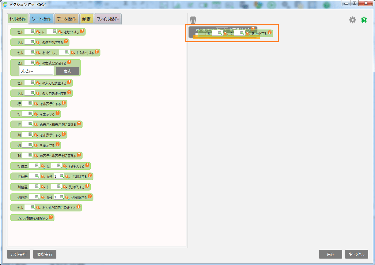 - 「アクションセット設定」ダイアログから使用するアクションのタブを選択し、左側のパレットエリアから使用するアクションをマウス左ボタンをクリックしたまま右側のエディットエリアにドラッグします。
