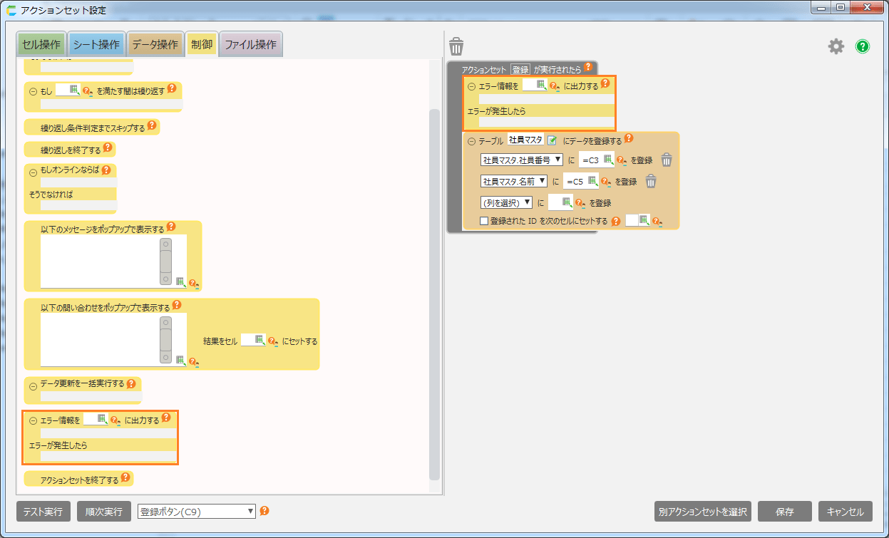 - 「制御」タブから「エラー情報を出力する」アクションをドラッグし、エディットエリアに設定します。