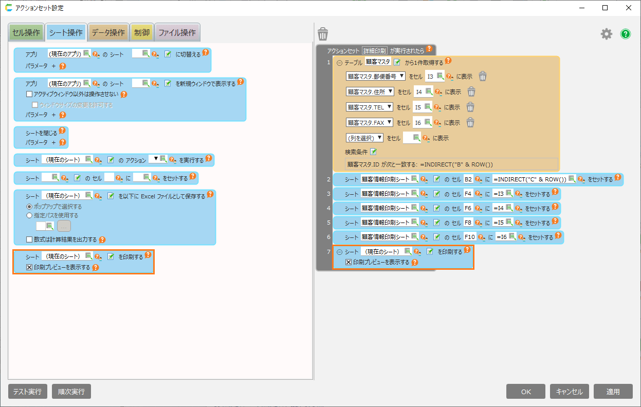 - 「シート操作」タブから「シートを印刷する」アクションを設定します。