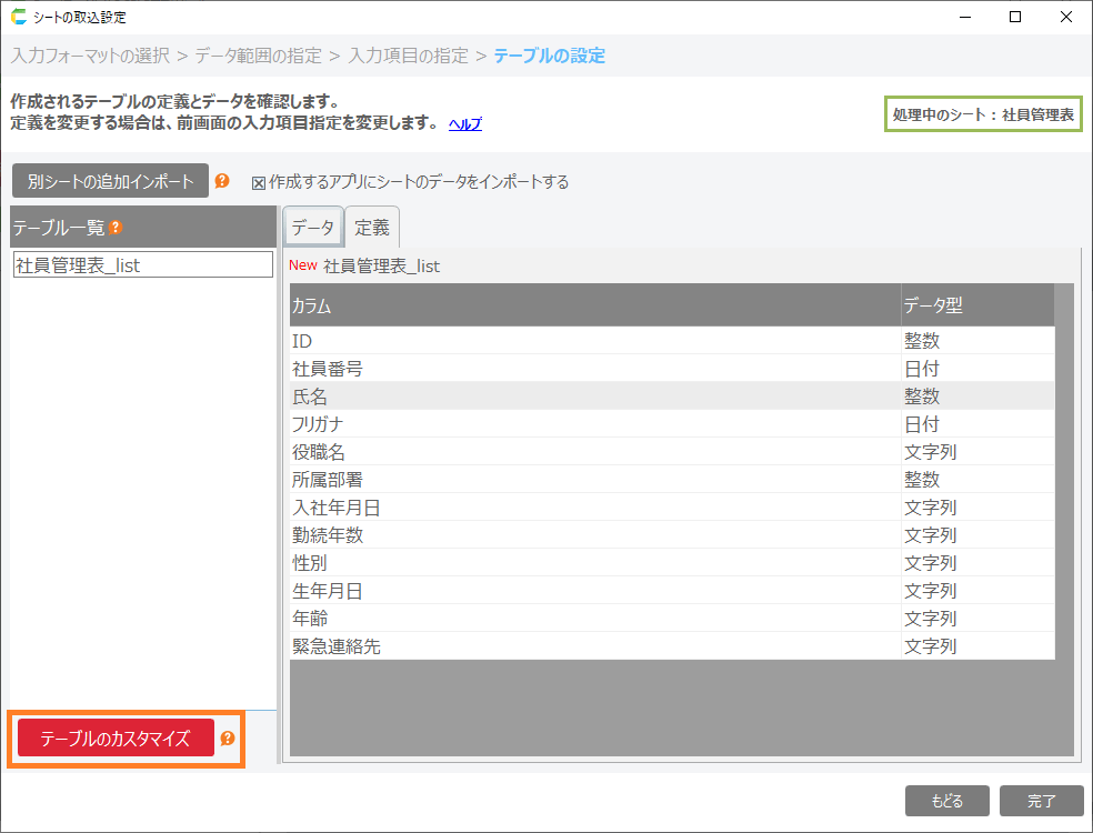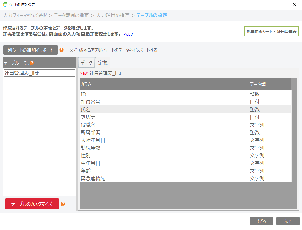テーブル定義画面まで進めてください。